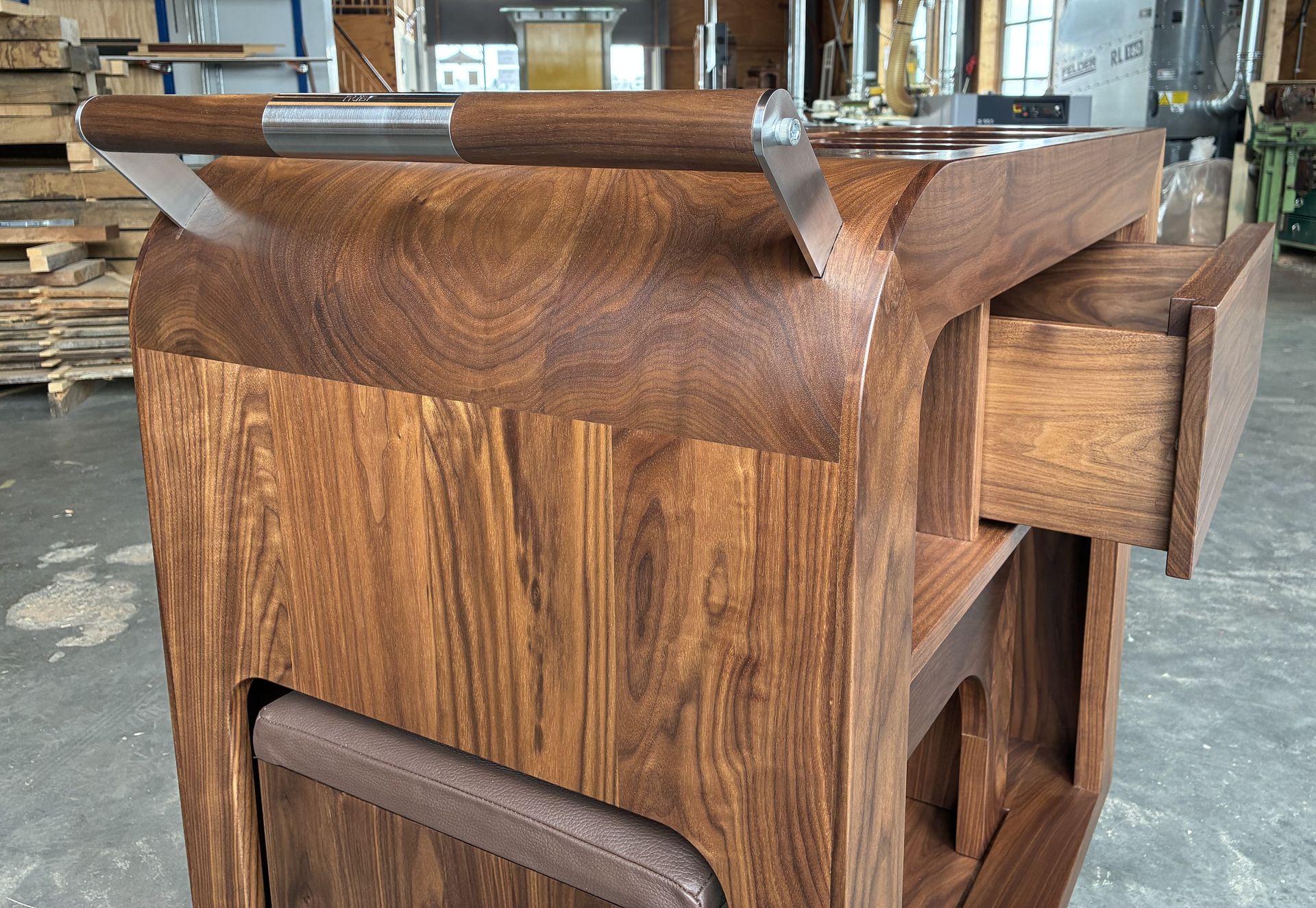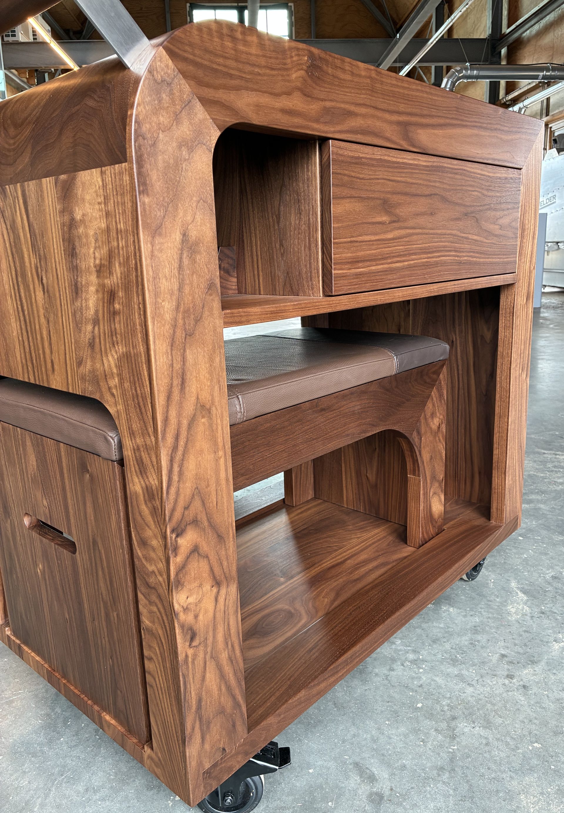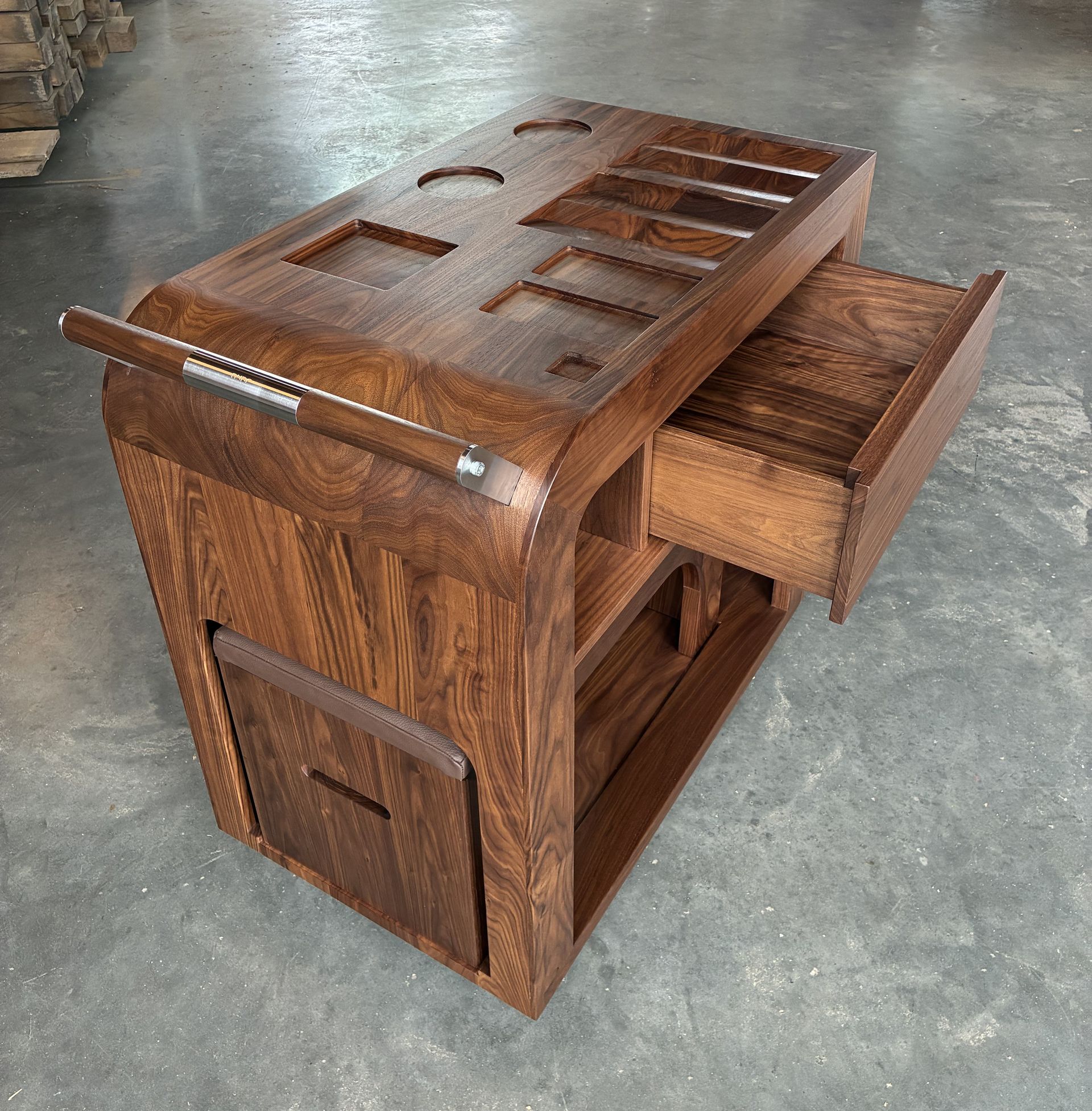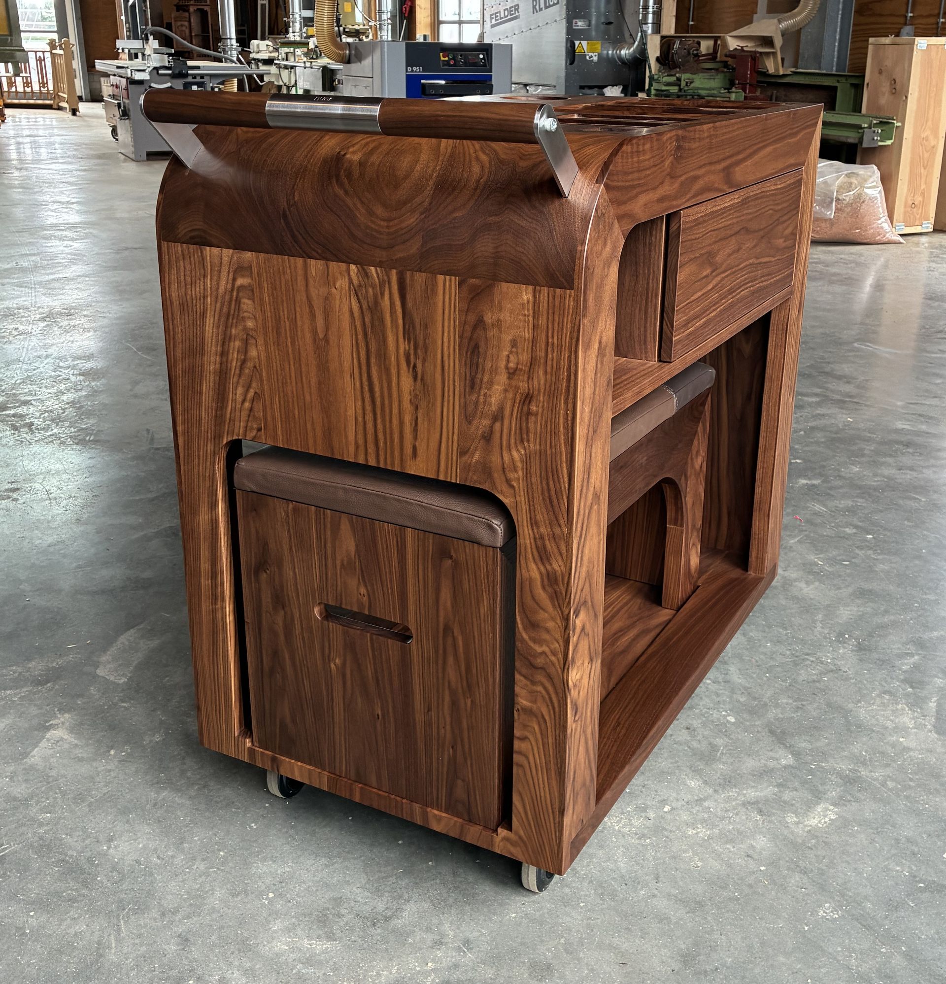 Trolley van Amerikaans noten met fitnessbankje en lade.