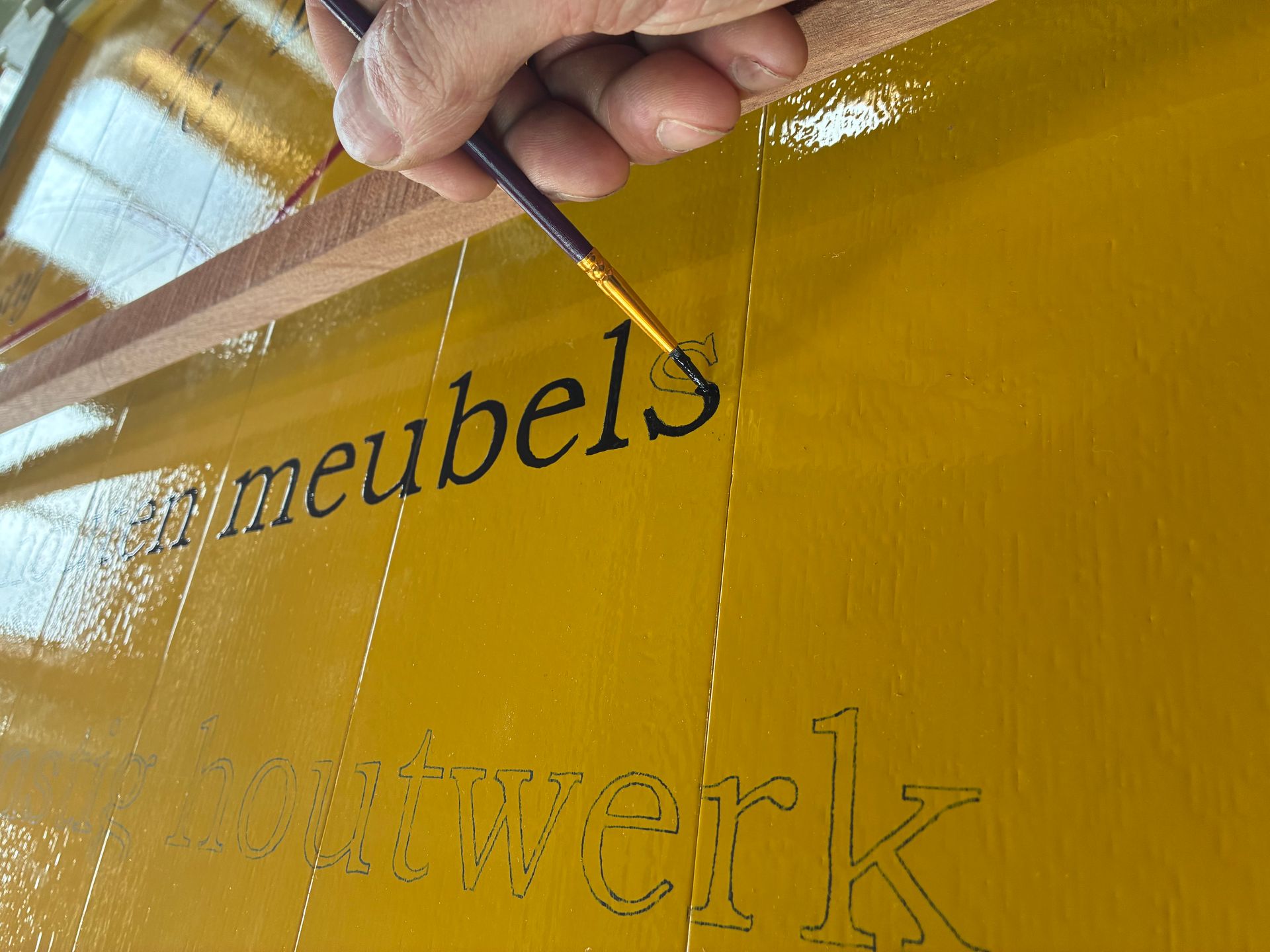 Reclamebord gemaakt van eikenhout en handgeschilderd