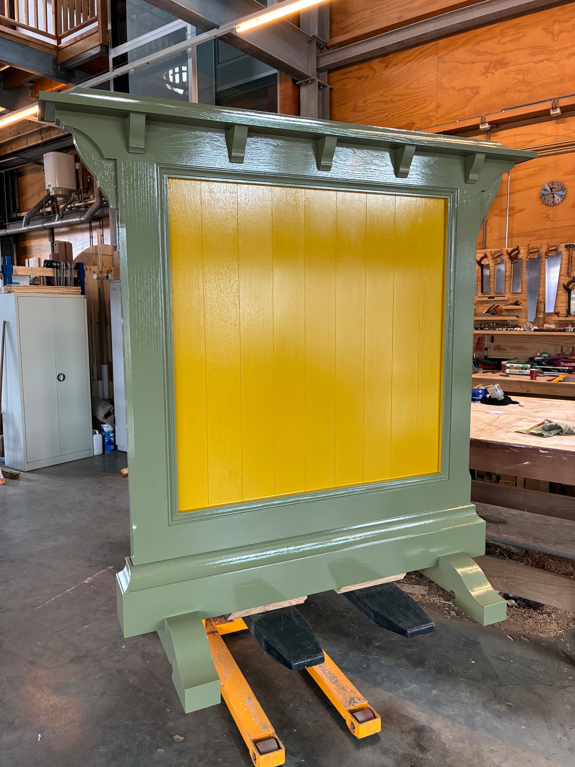 Mahonie wandpaneel opgebouwd uit 138 delen.