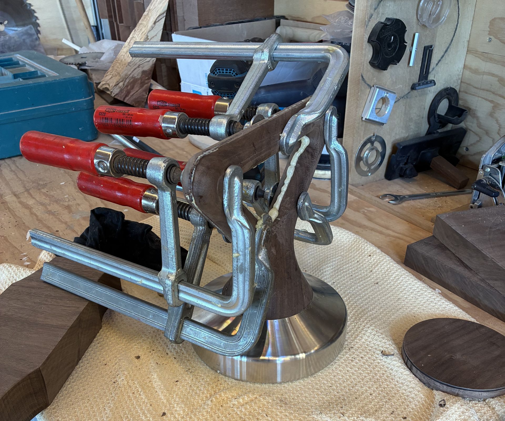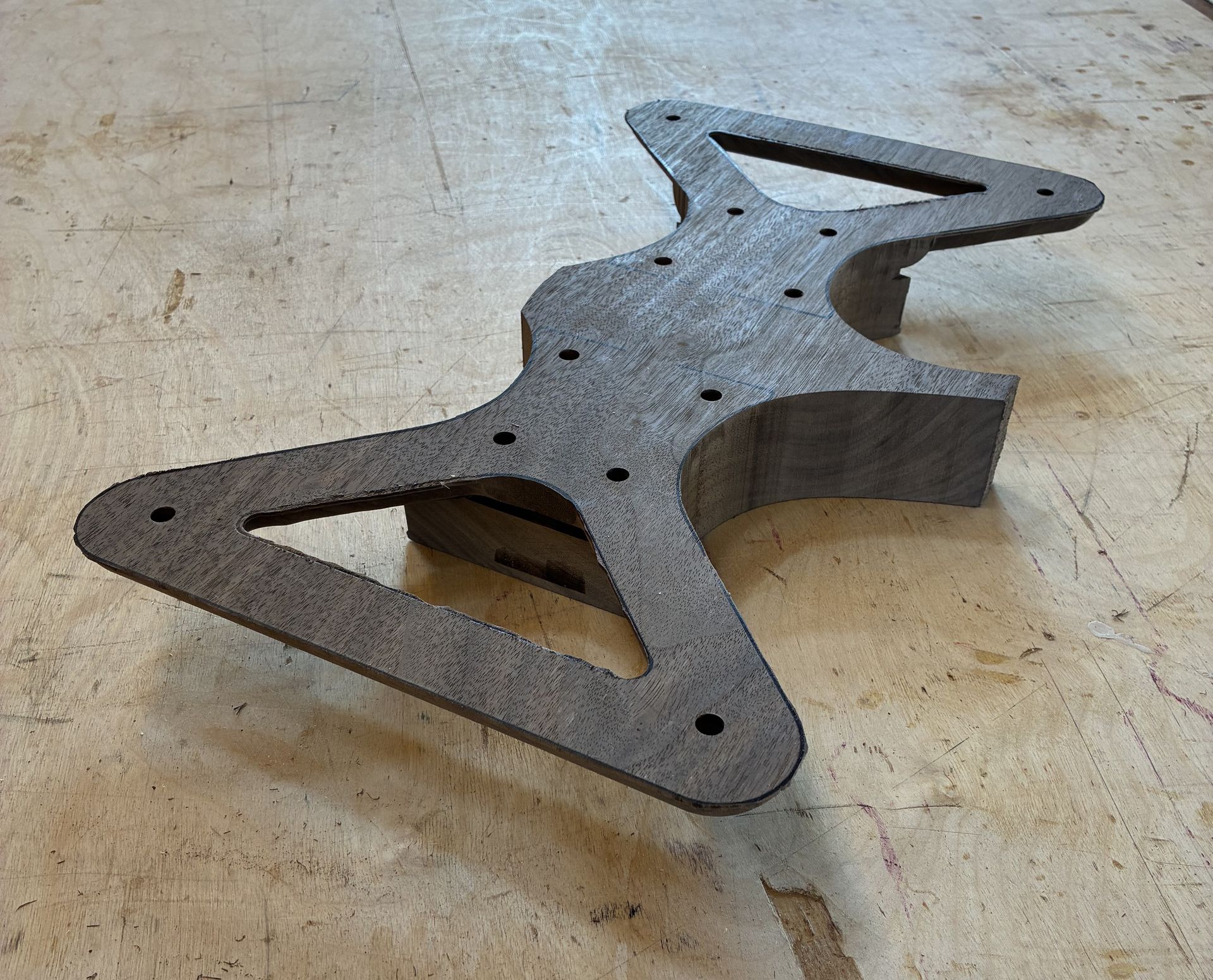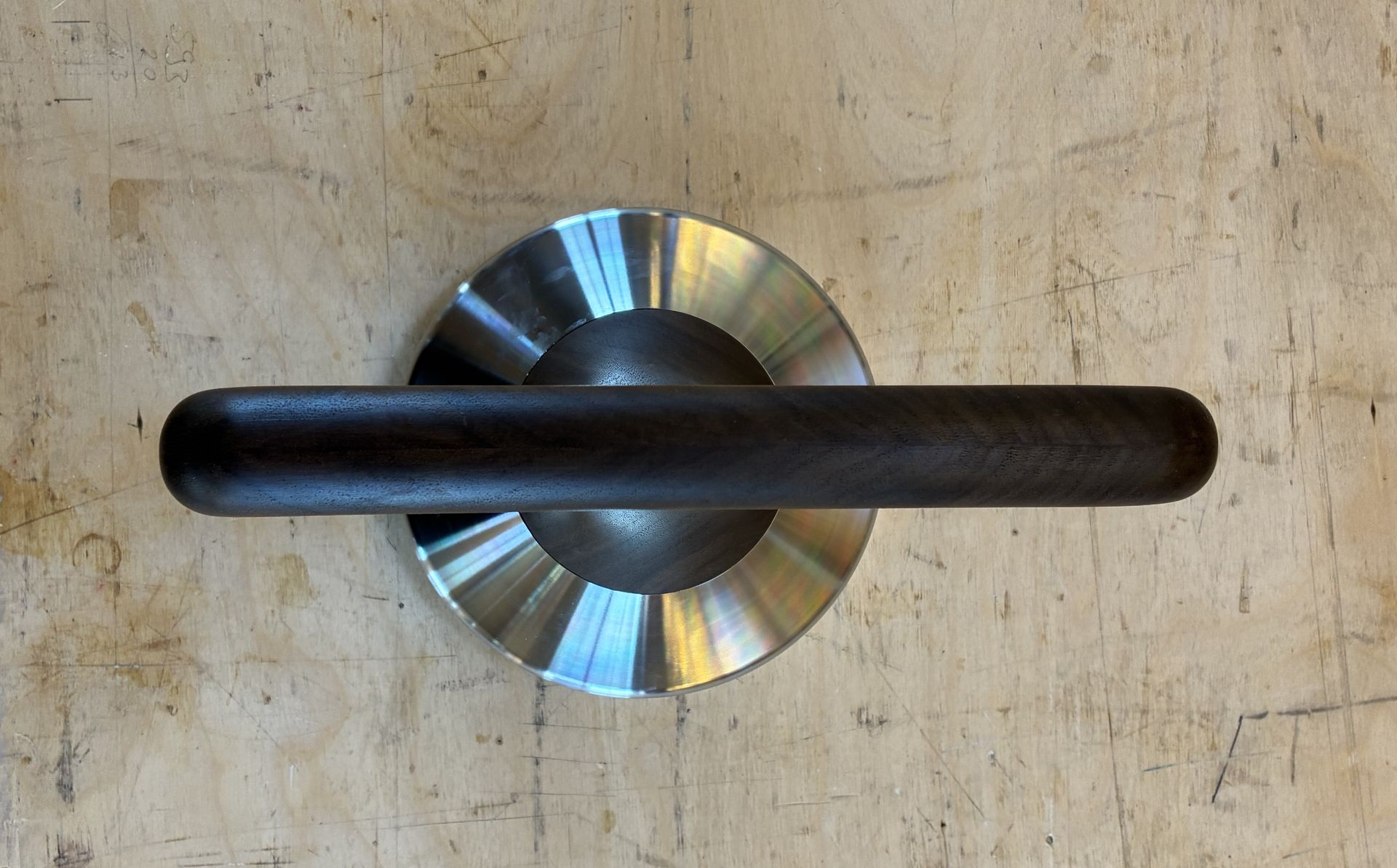 Boven in het blad zijn infrezingen gemaakt voor o.a. kettlebells en dumbells en een leren bal.