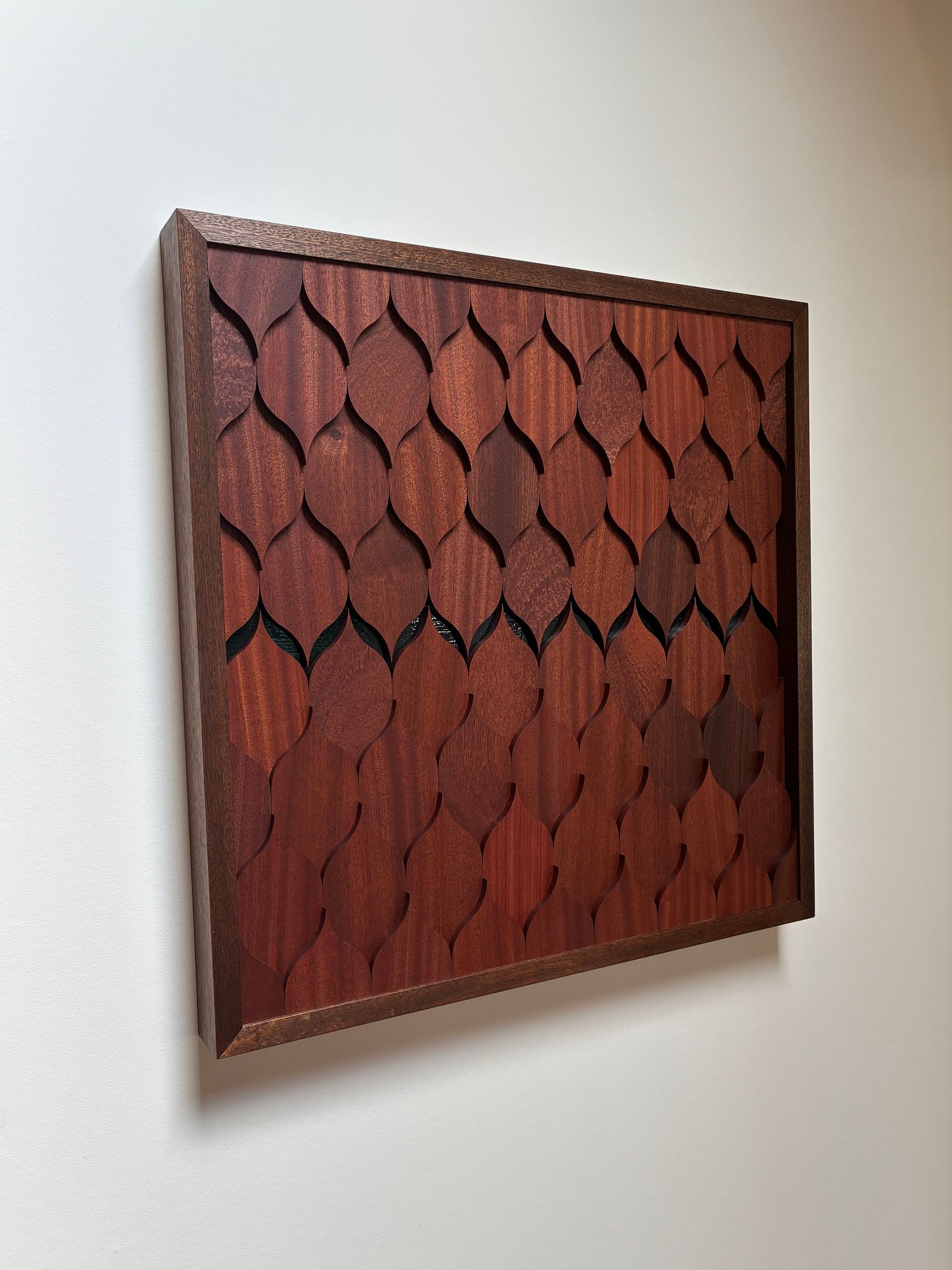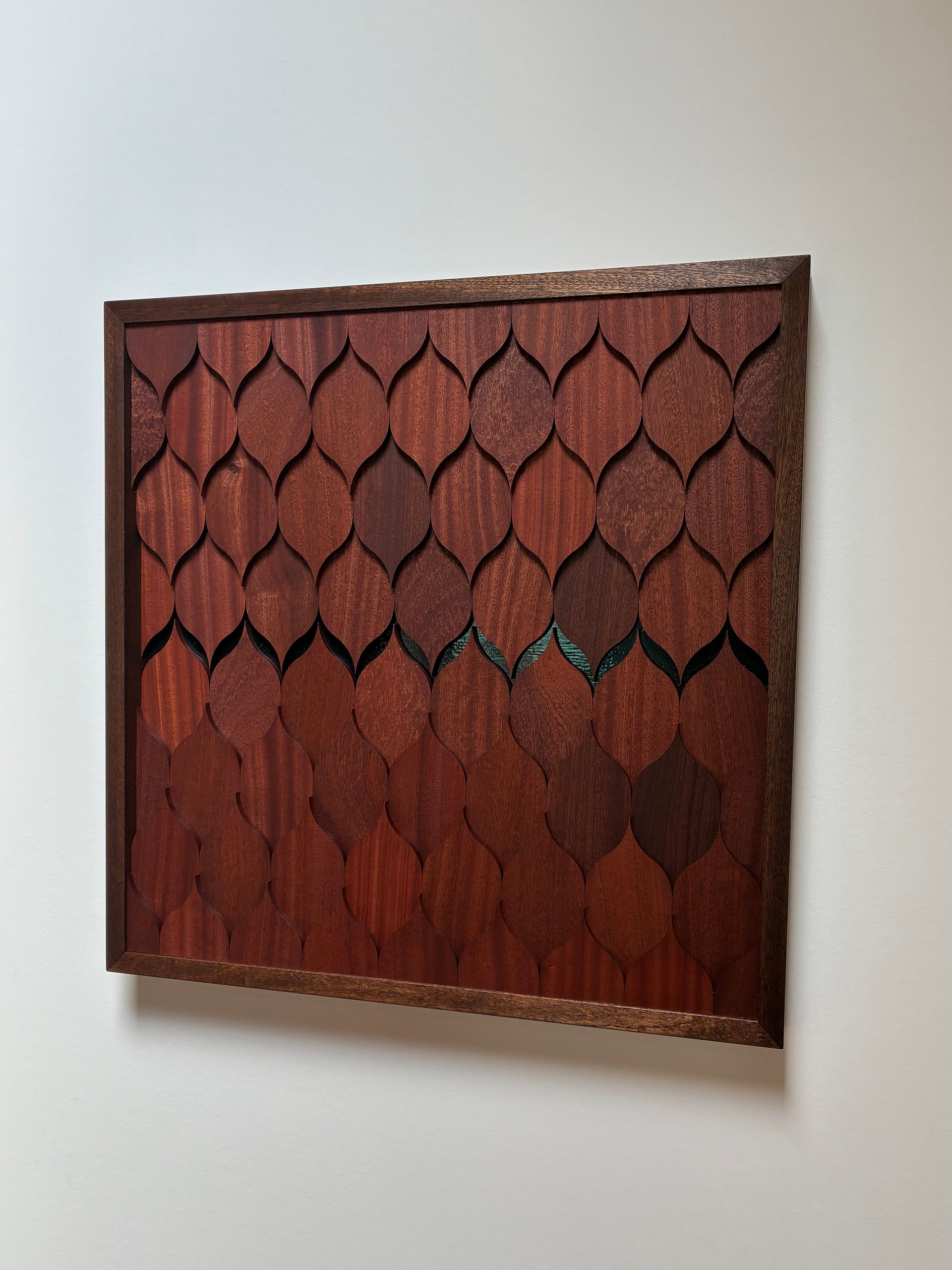 Het blad van deze tafel is gemaakt van mahonie. De nerven in het blad zijn ingelegd met kopshout, ook mahonie.