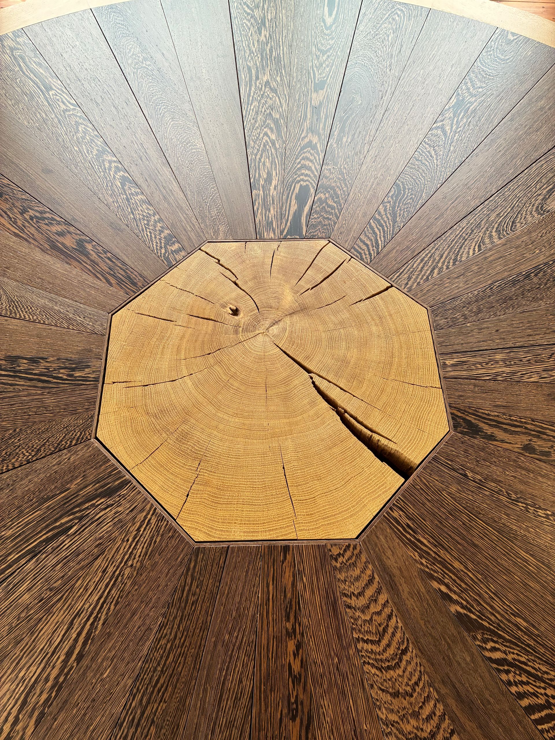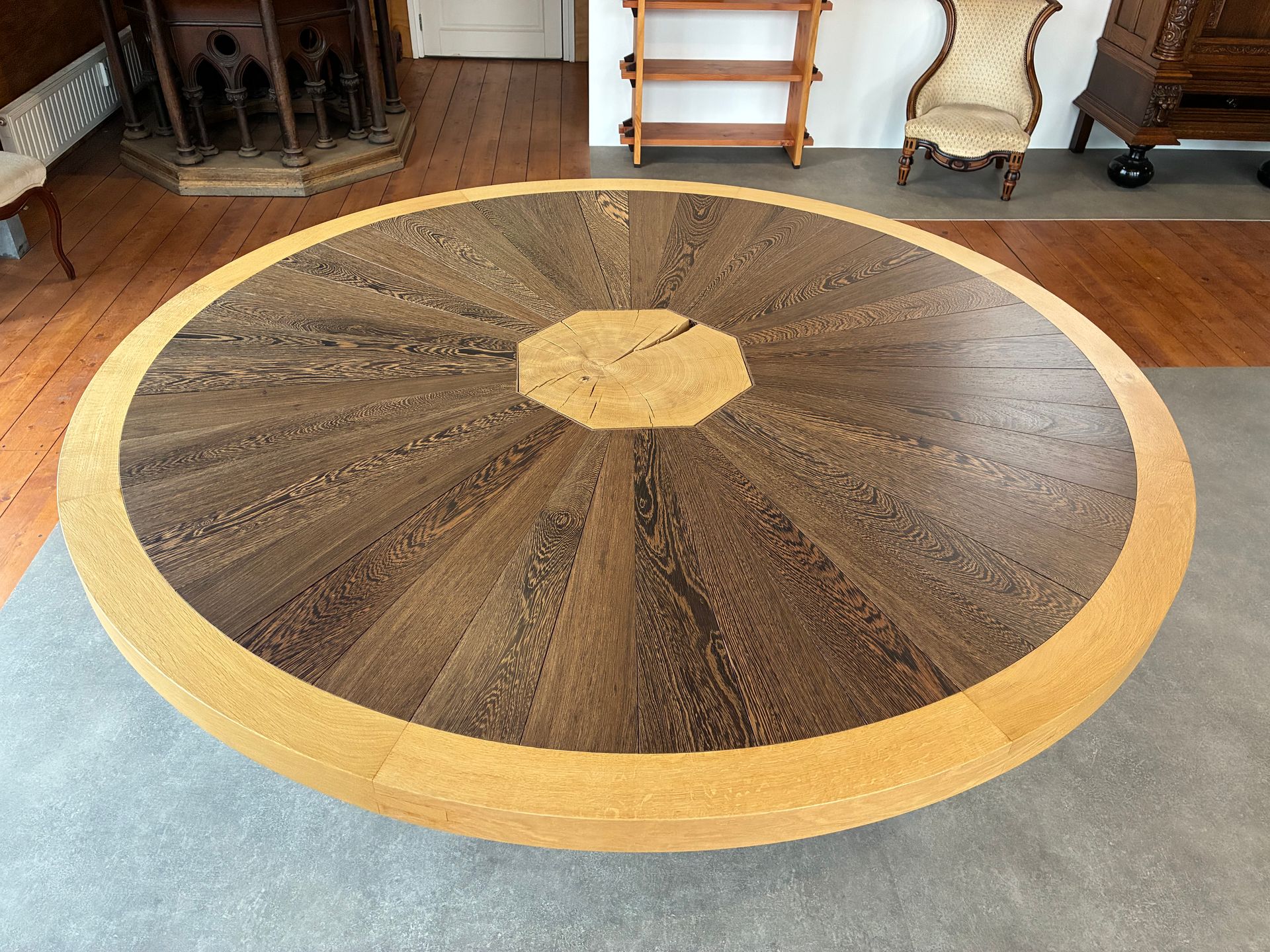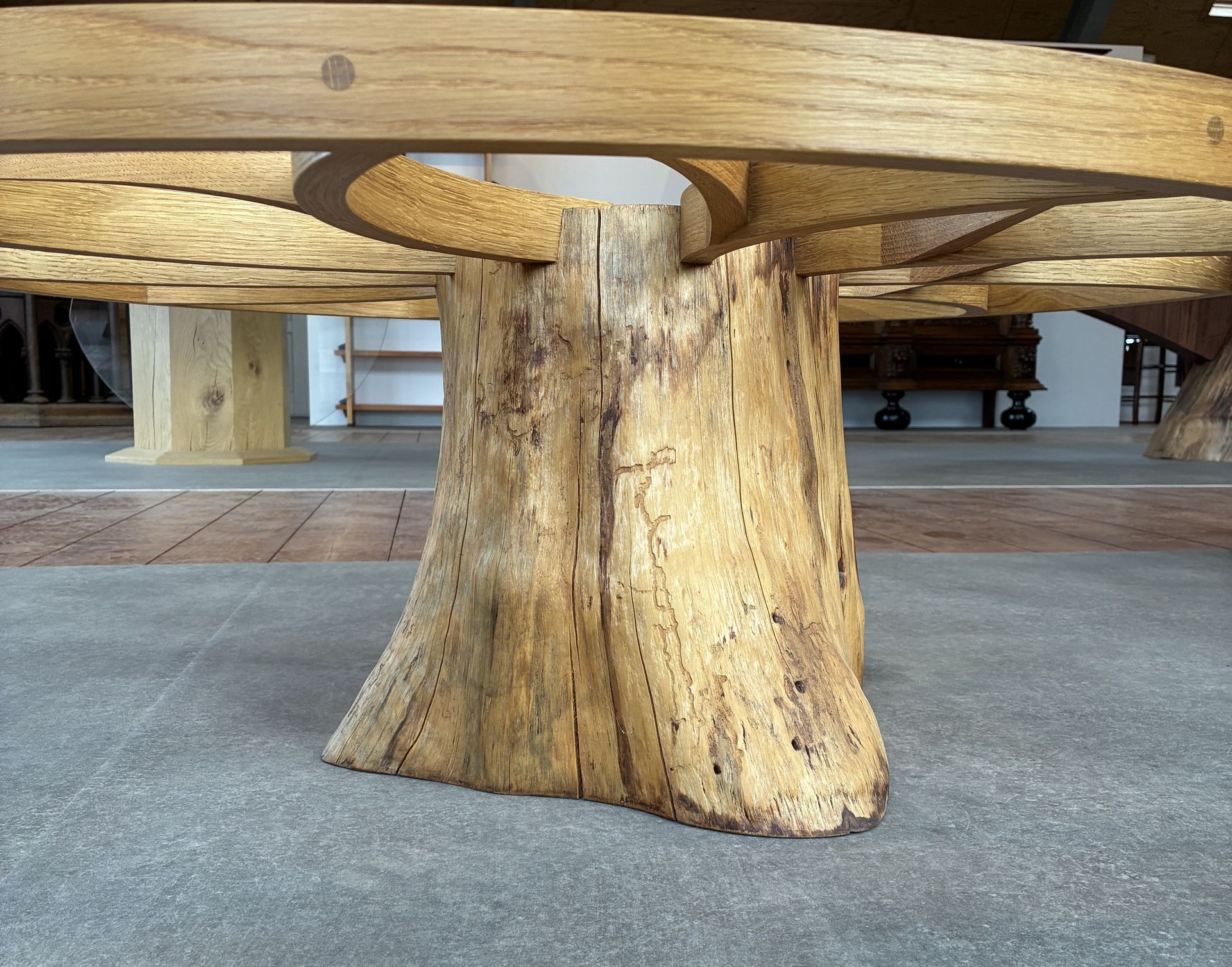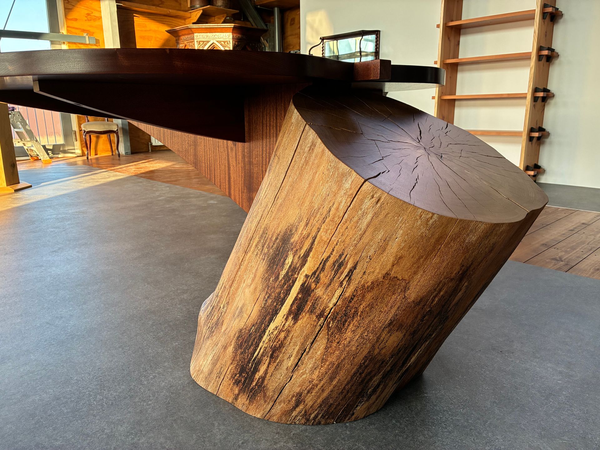 De poot van deze tafel is een massief blok eiken met zwaluwstaart verbindingen van wengé. De buitenste rand van het blad is gemaakt van eiken krommers waardoor de houtnerf met de ronding van het blad mee loopt. Het binnenste gedeelte van het blad is van wengé. De doorsnee van de tafel is 200 cm, hoogte 78 cm.
