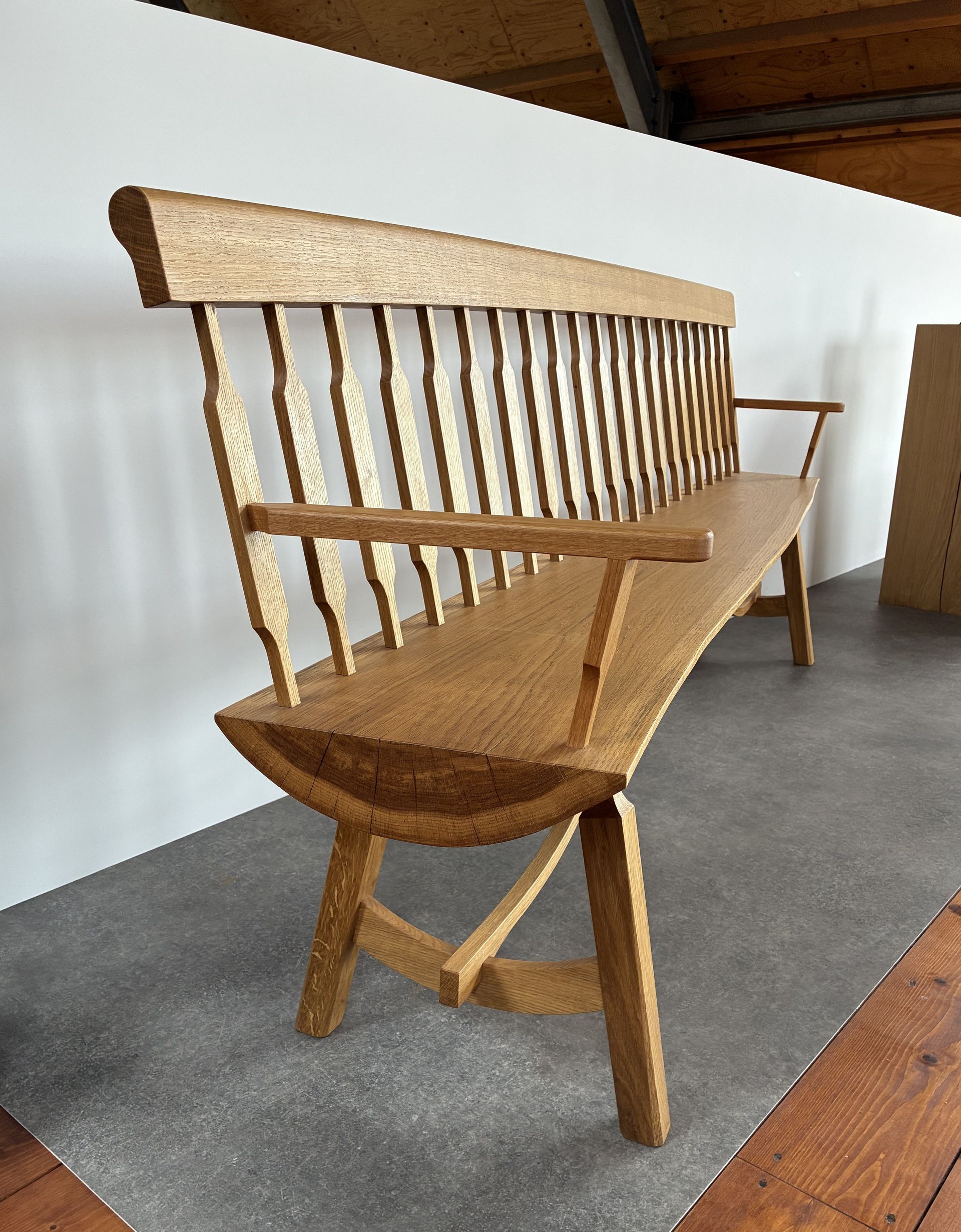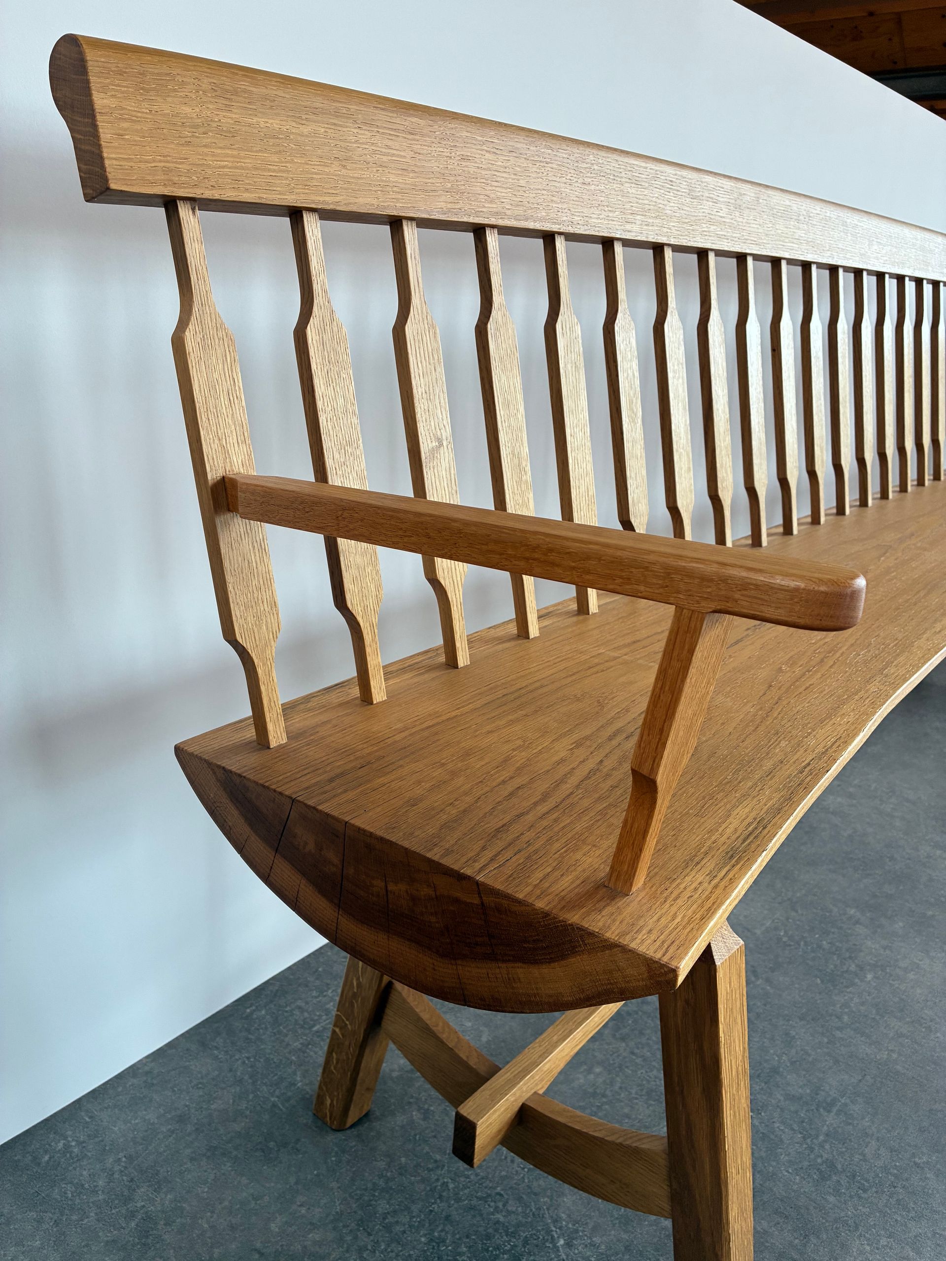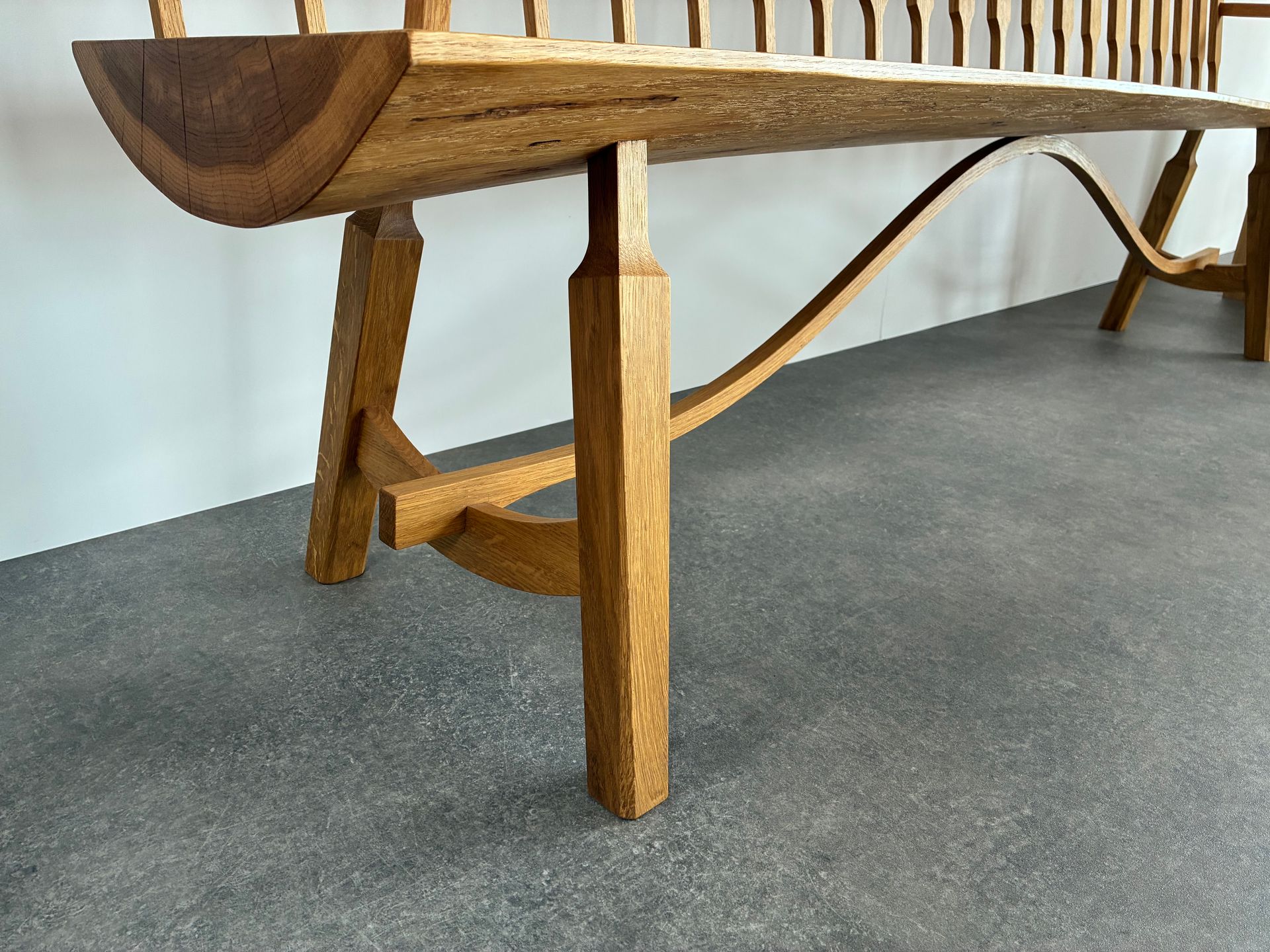 De zitting van deze bank is een schaaldeel en verloopt in dikte en in breedte, aan de linkerkant is de zitting dikker en breder dan aan de rechterkant. De zitting is ook licht getoogd wat terug komt in de rugleuning, de bovenkant van de rugleuning is ook licht getoogd gelijk aan de zitting. Deze bank zit volledig met houtverbindingen in elkaar. Gemaakt van eiken.
