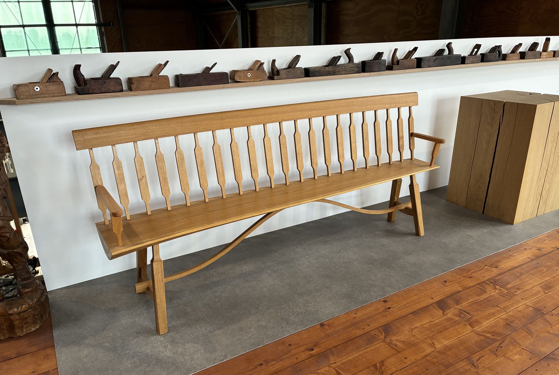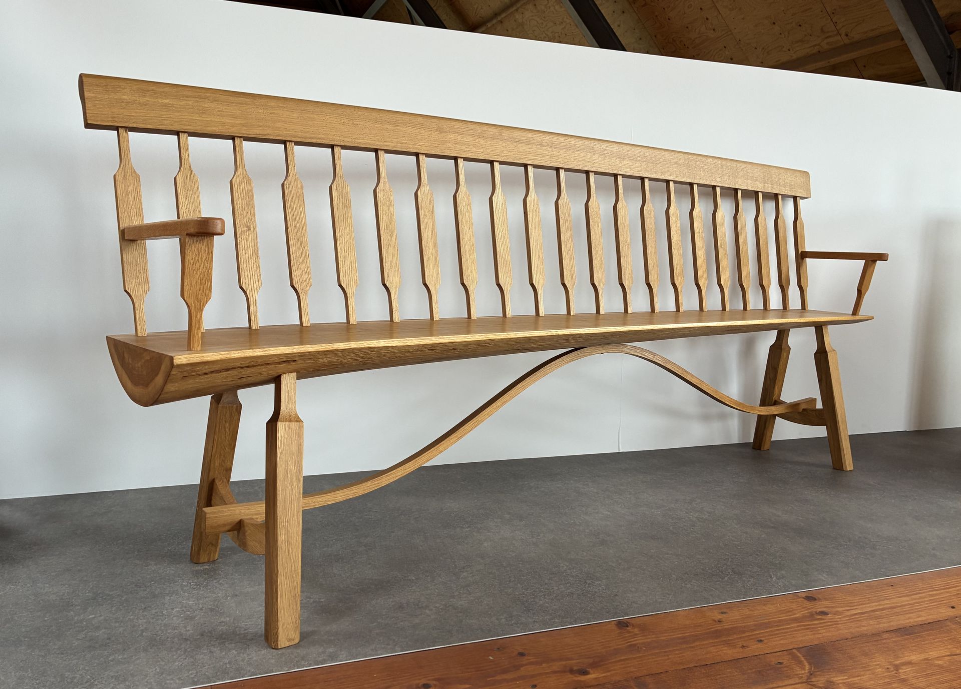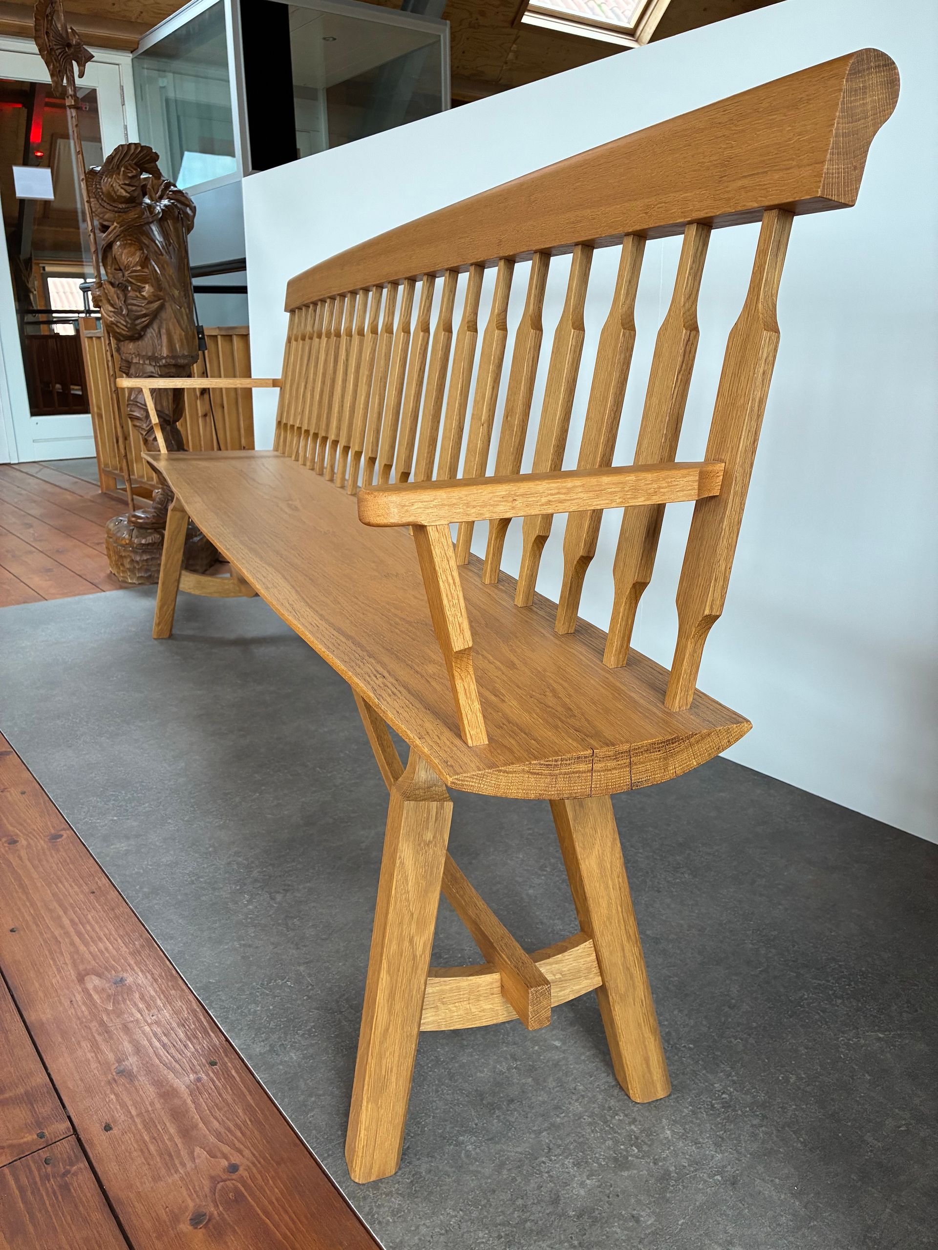 De zitting van deze bank is een schaaldeel en verloopt in dikte en in breedte, aan de linkerkant is de zitting dikker en breder dan aan de rechterkant. De zitting is ook licht getoogd wat terug komt in de rugleuning, de bovenkant van de rugleuning is ook licht getoogd gelijk aan de zitting. Deze bank zit volledig met houtverbindingen in elkaar. Gemaakt van eiken.