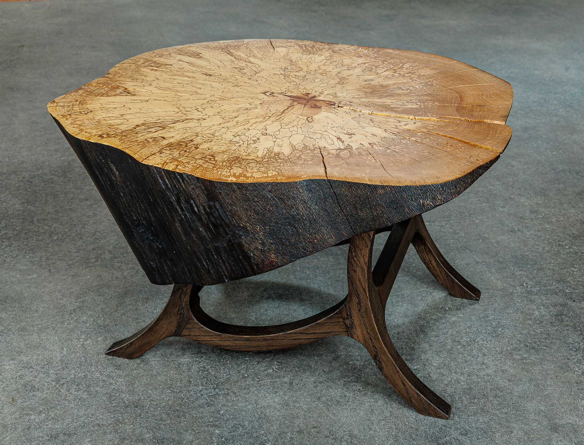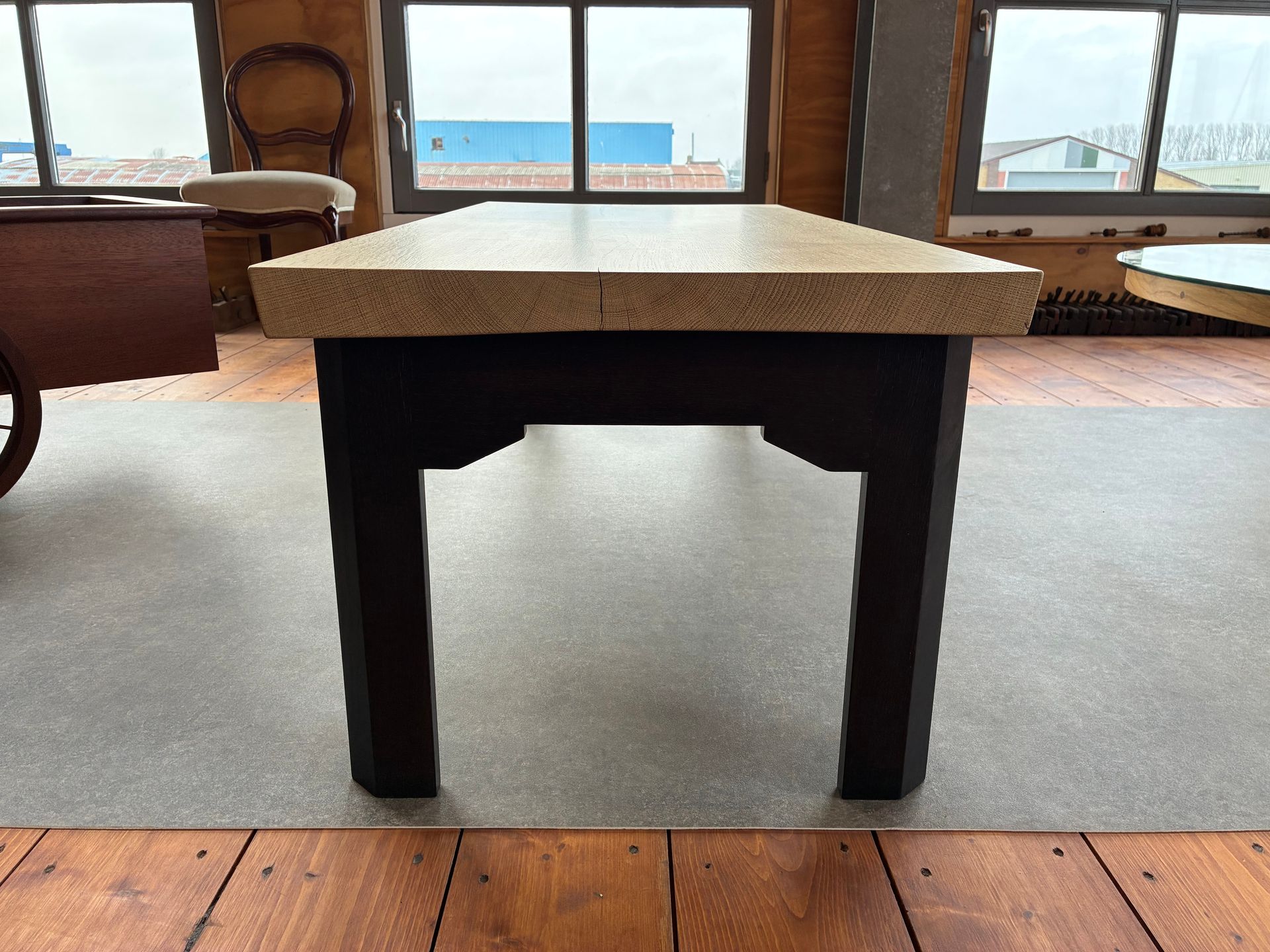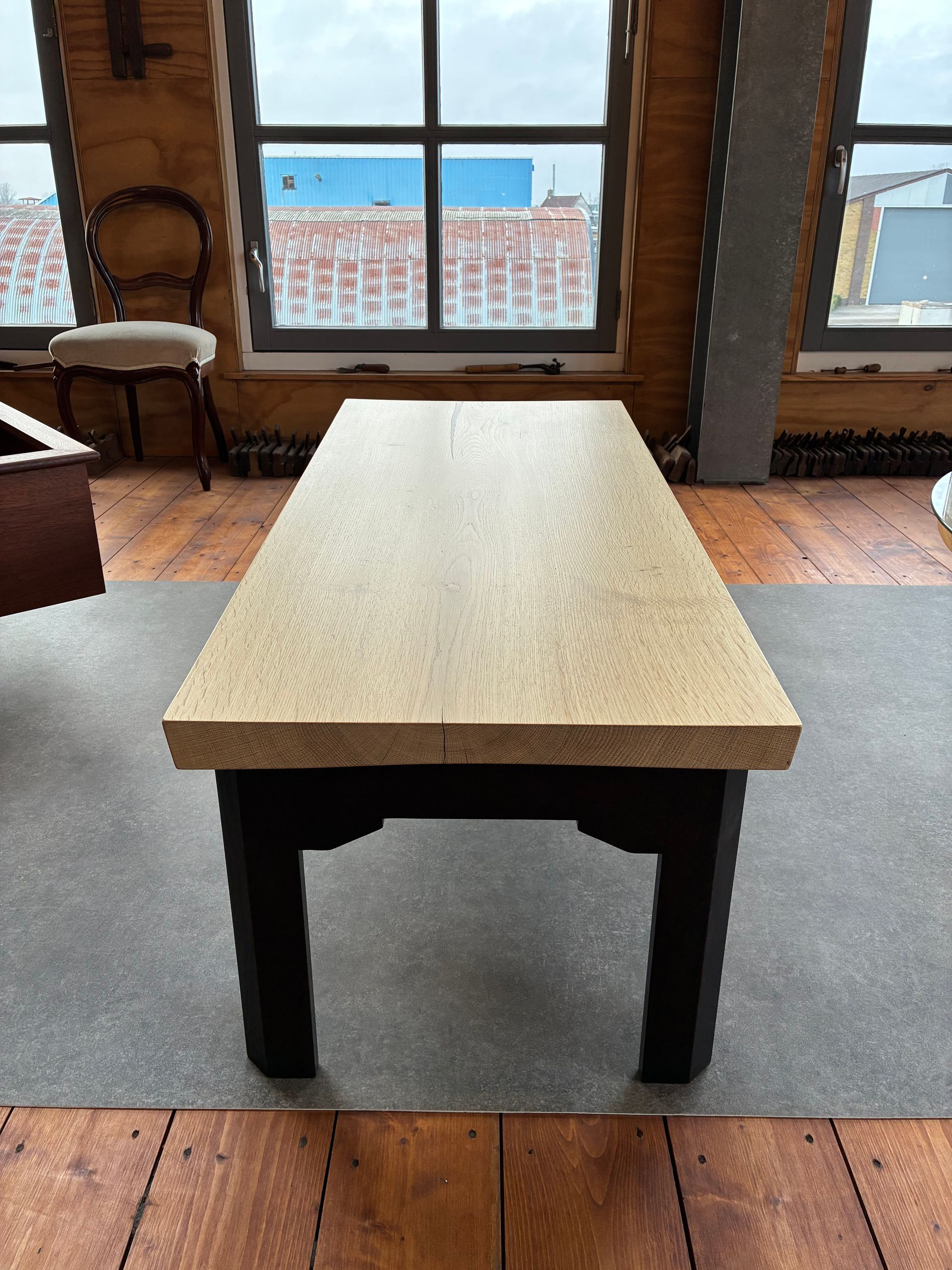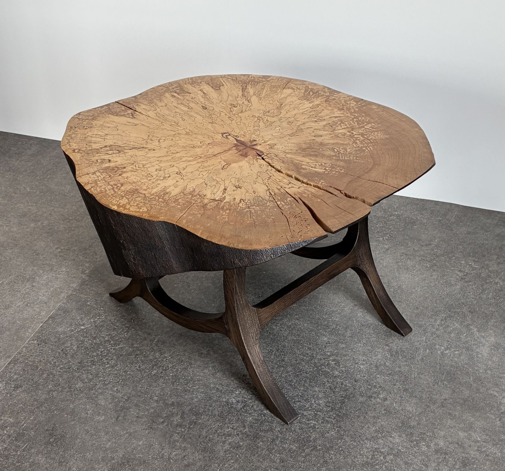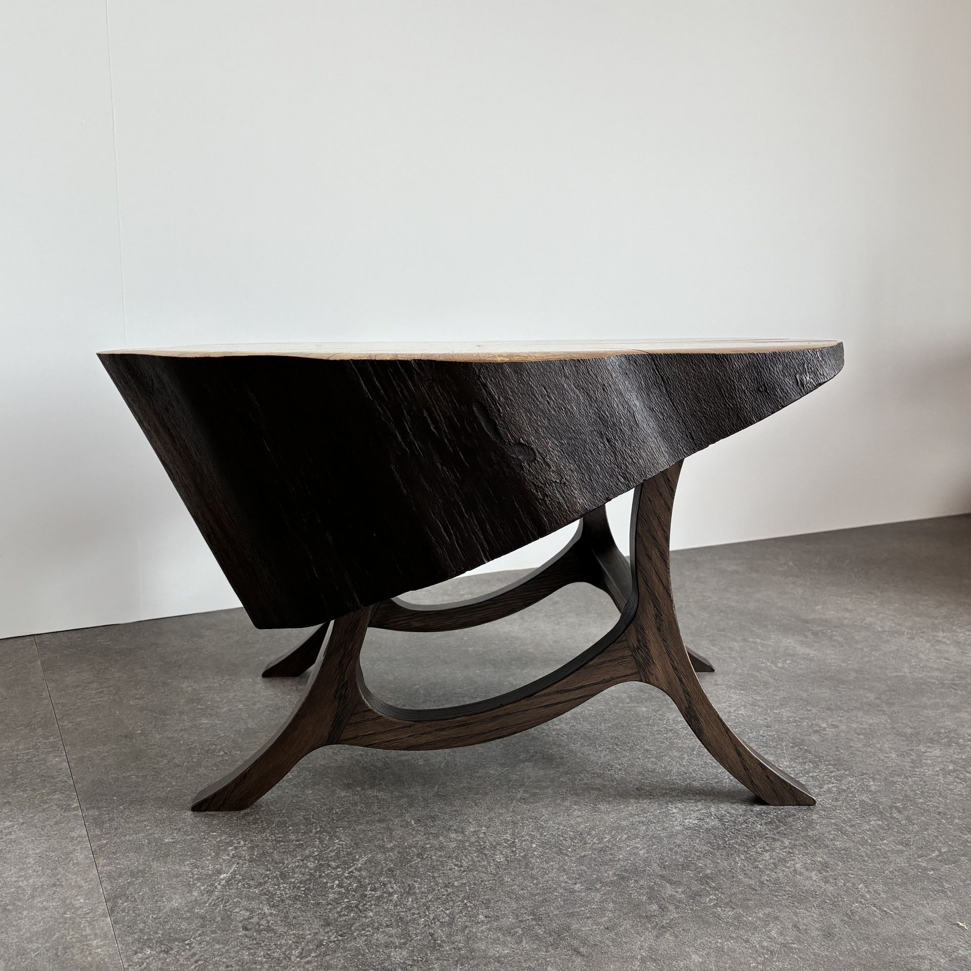 Het stuk beuken staat op gekromde en golvende poten van eikenhout.
