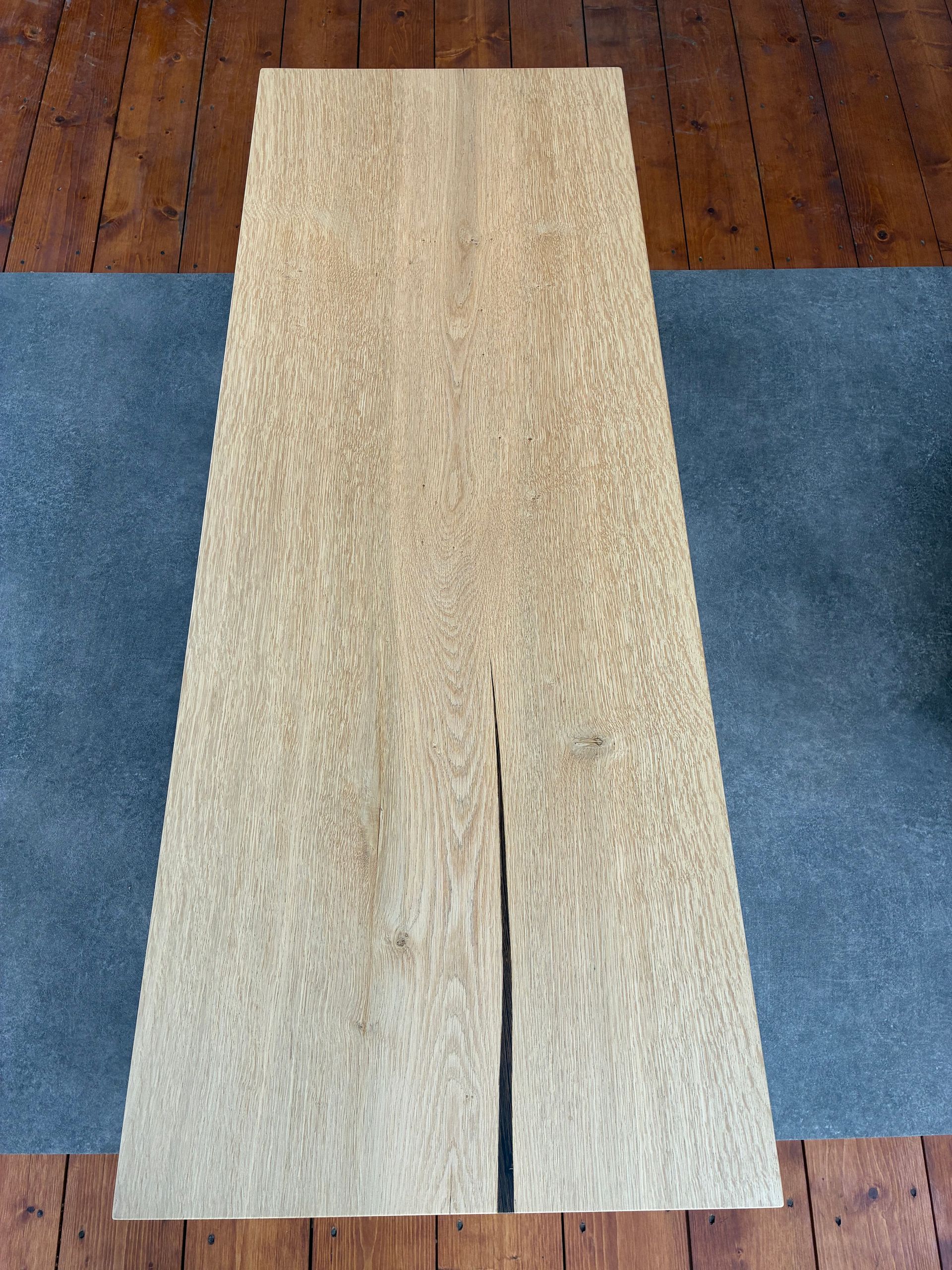 Tafel van eiken. De scheur in het blad, wat is ontstaan door het droogproces, heb ik opgevuld met een stuk wengé. Exact in model gemaakt en er in verlijmt. Het blad is niet evenwijdig, de ene kant is breder dan de andere, gelijk aan de tekening van het hout. De poten zijn ook eiken en op kleur gemaakt in de kleur wengé.